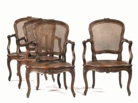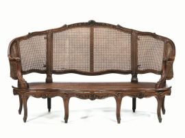 Finimento da salotto canné, Francia, metà sec. XVIII, in noce e legno dolce, spalliera sagomata centrata da composizioni floreali e tralci di foglie,braccioli a giorno su sostegni mossi, gambe sinuose su piedi a riccioli stilizzati, spalliera e seduta in canneté composto da un divano a corbeille, quattro poltrone e quattro sedie (9)