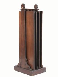 Grande tavolo da pranzo allungabile, Inghilterra, metà sec. XIX, in piuma di mogano, piano rettangolare con becco di civetta, gambe tornite e scannellate a balaustro su piedi a rotelle, movimento a vite con manovella, chiuso cm 141x136x77, competo di porta prolunghe in mogano, costituito da due sostegni rettilinei con eleganti volute alla base e cinque prolunghe di cm 54 ciascuna, recante antico cartellino di inventario del Monte di Paschi di Siena
