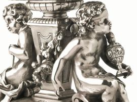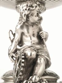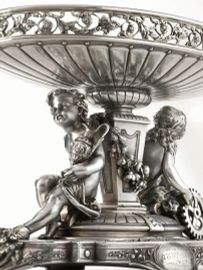 Alzata centrotavola, Birmingham, 1882, in argento, base di forma ovale sagomata decorata da una fascia di tralci fioriti e da due riserve iscritte JB e 1857-1883, fusto a plinto ai lati del quale poggiano due fanciulli a tutto tondo reggenti rispettivamente una ruota ed un’anfora, sottocoppa sbalzato a baccellature, bordo traforato, cm 34x19, alt. cm 22, base appesantita in legno, g 2700 lordi