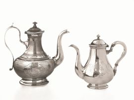 Caffettiera, fine sec. XIX, in metallo argentato ed inciso con monogramma entro riserva circolare, presa a voluta e finale del coperchio a trottola, alt. cm 17,5, lieve ammaccatura ed una teiera, Francia, fine sec. XIX, in metallo argentato anch’essa decorata da monogramma entro riserva circolare tra elementi fogliacei, alt. cm 21 (2)