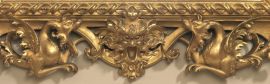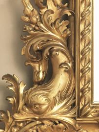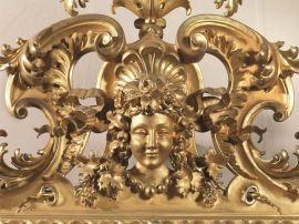 Grande specchiera, Firenze, 1860 circa, attribuita a Francesco Morini, in legno intagliato e dorato con alternanza di oro lucido e satinato, cornice rettangolare con bordo a tortiglione e ovoli e dardi, sormontata da ampia cimasa a timpano spezzato con palmetta di foglie di acanto centrata da testa di giovane Bacco con corona di pampini e uva che ricade sulle spalle; ai lati due vasi fiammeggianti e grandi volute vegetali sostenuta alla base da delfini di ispirazione cinquecentesca; nella parte inferiore mascherone ghignante fra due dragoni alati ruggenti, cm 262x153, lievi mancanze