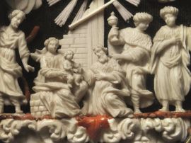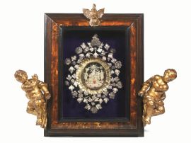Maestranze trapanesi e palermitane, Adorazione dei Magi, sec. XVIII, avorio, corallo, argento, rame, argento dorato, cm 37x26, entro cornice in legno e tartaruga arricchita da un'aquila al centro e due putti ai lati, cm 61x58.