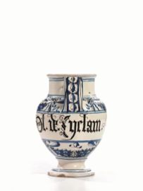 Orciolo, Bassano, sec. XVIII, in maiolica, decoro “a ghirlande” e nella fascia scritta apotecaria in caratteri gotici in bruno manganese, alt. cm 20,5, restauri al manico e allo smalto