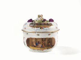 Zuppiera, manifattura di Meissen, fine sec. XVIII, in ceramica policroma di forma circolare, decorata sul corpo con due scene di banchetto entro riserve ovali intervallate da composizioni floreali; uguale decoro si ripete sul coperchio, impreziosito da due figure di bambini a tutto tondo contornate da quattro grappoli d'uva, alt. cm 25, diam. cm 25, alcuni restauri sul bordo superiore