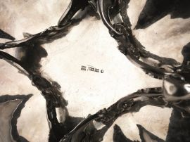 di forma ovale, in argento, interno vermeil, tesa decorata da volute di foglie, quattro piedini a ricciolo, cm 31x26, g 835