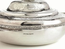 in argento sterling, due prese laterali finemente cesellate a volute, coperchio inciso con presa modellata a bocciolo, completa di vassoio con tesa sagomata, diam. cm 18,5, g 1700