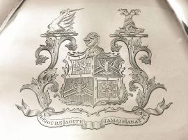 in sheffield plate di forma ovale con decoro a tralcio di volute fogliacee e stemma nobiliare inciso con cartiglio iscritto toutjours agite jamais abbate, presa a foglie contrappote, cm 45x34