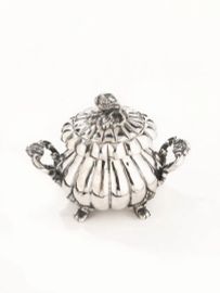 in argento sbalzato, due anse a volute, presa del coperchio a bocciolo, g 600 (4)