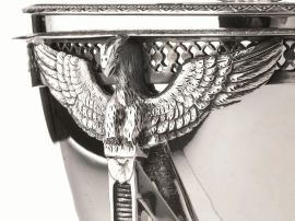 in argento, corpo semisferico poggiante su alto sostegno tripode con lesene terminanti a zampa ferina e con capitelli modellati ad aquila, base triangolare con tre piedini in foggia di grifi, presa del coperchio a ghirlanda circolare con nastro, alt. cm 24,5, g 750