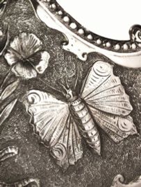 on spreading circular foot decorated with lanceolate leaves around the border, the stem with an oil receptacle with four spouts, the shade elegantly embossed and chased with flowers and butterflies, beaded loop handle, 96cm high, weighted base