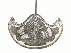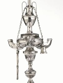 The mark on the oil lamp, which resembles a Gothic eagle, is the one used by the silversmith from 1765 to 1810. From 1811 to 1822 the mark will become A96C in a lozenge.