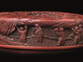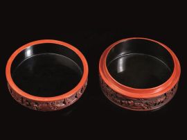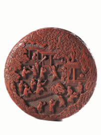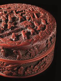 il coperchio finemente inciso è scolpito ad altorilievo attraverso gli innumerevoli strati di lacca rossa e raffigura la scena dei “100 bambini” che giocano, suonano e si rincorrono in un giardino, sotto la visione del Dio degli Esami Kui Xing, servitore del Dio Della letteratura, di fronte alle terrazze di un grande palazzo nobile circondato da una folta vegetazione.