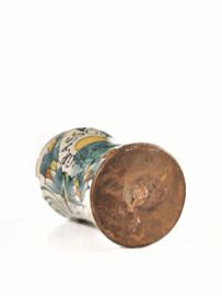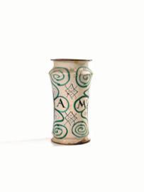 L’albarello, con l’esemplare che segue, deriva da una farmacia non individuata e mostra, per caratteristiche tecniche formali e stilistiche, affinità con i corredi farmaceutici attribuiti alle manifatture derutesi (1) o comunque della zona dell’Umbria e Alto Lazio dei primi decenni del secolo XVI.