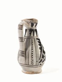 Il boccale ritenuto opera fiorentina della prima metà del XV secolo, è stato pubblicato da Galeazzo Cora (3) nel suo monumentale studio sulla ceramica di Firenze e del contado. Oggi, alla luce degli scavi più recenti, non possiamo più concordare con tale paternità: la morfologia non corrisponde ai boccali toscani, ma ci fa propendere per una produzione dell’Alto Lazio.