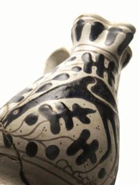 Il boccale in oggetto si inserisce pienamente nell’ambito produttivo sopraindicato e ha mostra numerosi confronti da un punto di vista morfologico (2), mentre dal punto di vista decorativo, pur riprendendo il motivo della figura animale, la presenta in un modo più articolato ed elegante, posizionando l’uccello in un atteggiamento già quasi naturalistico. Un’opera prossima a quella in analisi può essere il boccale con cigno conservato al Museo del Vino di Torgiano (3).