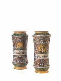 La spalla e il piede sono decorati con un motivo a piccoli frutti tondeggianti su un ramo sinuoso, delineati in giallo e giallo arancio su fondo verde intenso. Il corpo dei vasi mostra invece un decoro “bifronte” “a grottesche” con teste di amorini, mascheroni, racemi accartocciati e delfini, presenti simmetricamente sui due lati del contenitore con uno sfondo blu su un lato, e giallo arancio sull’altro. Il decoro è centrato da un medaglione contenete un busto maschile con turbante e scritta in caratteri capitali SALADINO nel primo albarello, mentre sull’altro il medaglione, di analoga proporzione, è decorato da un cagnolino in corsa. Sotto il medaglione corre poi un cartiglio con la scritta apotecaria in caratteri gotici Rcqfo:minor(um). Nell’altro albarello si ripropone il medesimo decoro, con un busto di soldato romano a variare il protagonista del medaglione; il cartiglio presenta la scritta S. Cufcute sempre in caratteri gotici.