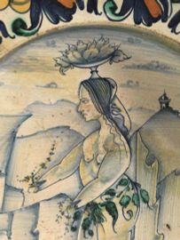 Ancora più notevole è la comparazione con il piatto con Ercole e Anteo del Metropolitan Museum of Art, recentemente esposto in un’importante mostra fiorentina (2). Il confronto con il nostro mette in evidenza apprezzabili parentele: la modalità nel dipingere il cielo e le nuvole come piccoli monticelli in un campo riempito a linee parallele; l’uso di un tratto grafico sottile in monocromia blu; il contrasto coloristico così marcato tra tesa e cavetto; ed infine il paesaggio roccioso, di gusto gotico. Proprio quest’ultima caratteristica ci porta a considerare una cronologia precoce: ma si tratta semplicemente di una proposta, dato l’esiguo numero di confronti fino ad ora analizzati.