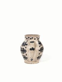 Maiolica, corpo ceramico di colore ocra chiaro, appena rosato. Smalto color crema di lucentezza marcata, ma steso in uno strato poco spesso che lascia trasparire il colore dell’impasto; la smaltatura si estende anche all’interno del contenitore. Decoro “a zaffera” in blu di cobalto e piombo poco rilevato, orlato con tratti sottili di bruno di manganese piuttosto diluito.