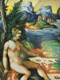 La scena è dipinta con maestria e con grande dominio della materia. Il decoro è ricco e ben distribuito, con una composizione che rispetta appieno la prospettiva, sfruttando completamente la forma del piatto. La fonte incisoria d’ispirazione del nostro esemplare, al momento, non è stata riconosciuta e ipotizziamo che si tratti forse di più incisioni o di una reinterpretazione.