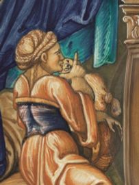 Le figure di scorcio, con i volti appena visibili, sono abilmente impiegate da Xanto Avelli nella composizione dell’opera, mentre la tenda le conferisce un tocco di colore richiamando il gusto per il verde scuro, così riconoscibile nelle opere del maestro rodigino. Lo scorcio del paesaggio è proporzionato e apre la composizione, che risuta ancora schematica e rigorosa, con un’attenzione alle proporzioni che in altre opere andrà perduta.