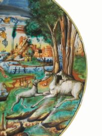 Recentemente è passato sul mercato (15) un piatto del servizio con raffigurazione della scena di Diana e Atteone, con modifiche e una certa libertà interpretativa nella raffigurazione della stessa: evidentemente il tema è caro alla bottega e comunque molto presente nel servizio. Un altro piatto raffigurante Maria è stato battuto a Parigi (16). E infine citiamo il piatto del British Museum con Ercole e Deianira (17), nella cui schedatura troviamo elencati gli esemplari finora noti, tra i quali uno con Diana e Atteone datato 1551 in collocazione non conosciuta, che potrebbe corrispondere al nostro.