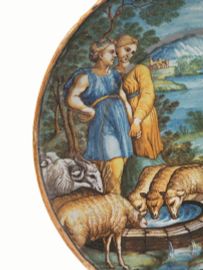 Piatto tondo con orlo liscio, ampia tesa orizzontale, corta balza e ampio cavetto. Il retro è interamente rivestito da un leggero strato di smalto stannifero che mostra sulla tesa pulci e i segni lasciati dai distanziatori di cottura. Attorno alla balza corre la scritta Iacob ad puteum vidit rachel; et adaquato grege, indicavit et, quod frater esset patris sui in corsivo nero di accurata calligrafia. L’orlo è color nocciola con un filetto bruno di manganese. Il dipinto è stato eseguito con i colori a gran fuoco sapientemente accostati. La scena è dominata dal blu dai toni molto forti nelle vesti delle figure e molto sfumati nel paesaggio, nelle lontane cime montuose, nel cielo; il modellato degli incarnati e del pellame animale è realizzato in giallo e bruno; tocchi di verde olivastro e smeraldo creano il prato, le fronde arboree e i ciuffi fogliati. Ed infine un sottile ripasso in bruno accentua i contorni delle figure e tocchi lumeggiati in giallo su prato e paesaggio ne vivacizzano il chiaroscuro.