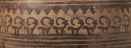 Decorazione: sull’orlo fascia in bruno, sulla massima espansione teoria di capridi dalle lunghe corna ritorte volti a sinistra, fra fasce di linee parallele orizzontali e motivi geometrici