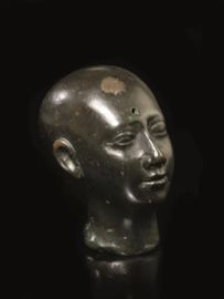 Testa di giovane sacerdote raffigurato con i capelli rasati, il cranio allungato, le orecchie sporgenti, le arcate orbitali appena accennate, gli occhi fortemente allungati con indicazione delle palpebre, il naso rettilineo, gli zigomi sporgenti e la bocca con le labbra dischiuse in un lieve sorriso.
