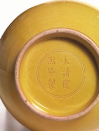 in porcellana gialla, incisi a motivi floreali, recanti marchio Kangxi, alt. cm 34 (2),
