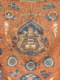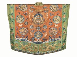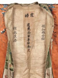 Veste, Cina sec. XIX, in seta ricamata riadattata al gusto giapponese, finemente lavorat a motivi di draghi e gru, internamente reca iscrizione con datazione al mese di novembre dell'anno 1836, periodo Daoguang, e riferimenti alla famiglia di Cheng Hang Sheng