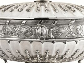 Grande zuppiera, Francia, sec. XX, in argento, di forma ovale su piede ellittico, coperchio e vasca baccellati e decorati a volute vegetali che inquadrano uno stemma nobiliare e un monogramma, anse a doppio ricciolo, presa a fiore stilizzato, diam. cm 35,5, alt. cm 21, g 4800