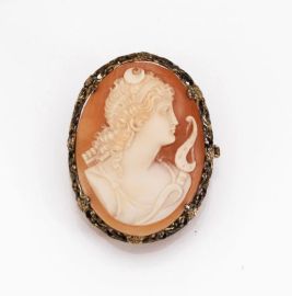di forma ovale rispettivamente raffiguranti: profilo femminile in vesti classiche con montatura a spilla-pendente in oro giallo a basso titolo inciso a volute; profilo femminile in vesti classiche con farfalla montatura a spilla-pendente in oro giallo e microperle; profilo di Diana cacciatrice, montatura traforata in oro a basso titolo e argento traforati a volute (3)