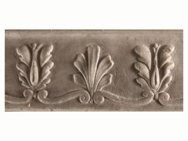 Console semicircolare, secc. XVII-XVIII, in marmo bianco scolpito, bordo decorato con catene di palmette aperte, fusto troncopiramidale scannellato desinente a zampa ferina e collegato al piano mediante tre mensoloni a volute di foglie d'acanto, cm 144x57x82