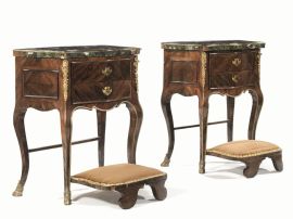 Due comodini, Roma, metà sec. XVIII, in palissandro con applicazioni in bronzo e rame dorato, piano sagomato in marmo verde antico profilato in bronzo dorato, fronte e fianchi mossi, due cassetti, piccola pendaglina sagomata frontale e laterale, eleganti gambe sinuose con scarpette in bronzo dorato modellate a zoccolo equino, cm 87x64x 40 e cm 87x 59x39, simili fra loro, piccoli danni (2)