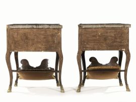 I due piccoli mobili studiati non formano propriamente una coppia essendo un esemplare lievemente più largo e più profondo dell’altro. Sia le loro caratteristiche tecniche che le soluzioni date a sagoma e ornato dimostrano inconfutabilmente che essi furono approntati insieme, nello stesso momento, per un medesimo ambiente. Stilisticamente i due arredi risultano parte di un gruppo di mobili eseguiti a Roma attorno alla metà del Settecento. Si tratta di alcuni comò che si accomunano per un uso analogo delle impiallacciature in palissandro, con i pannelli disposti in modo che le venature formino dei rombi su facciate e fianchi, incorniciati da listelli e arricchiti frontalmente da cospicue applicazioni bronzee; altra caratteristica comune è la sagoma squadrata del corpo retto da zampe slanciate, spesso rettilinee (2). Uno di questi comò, però, ha zampe incurvate e un andamento del grembiule frontale del tutto analogo a quanto si vede nei nostri due mobili coi quali condivide anche i sostegni con guaine caprine e il tipo di marmo sul piano, il verde antico.