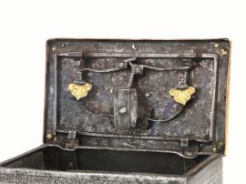 Piccolo scrigno, Norimberga, sec. XVI , in ferro acciaioso inciso all’acquaforte su tutte le facce, decorato con figure di dame e cavalieri, il coperchio è costituito da una fine lastra in rame intagliata a motivi floreali rifinita da cornice dorata, è presente una lamella scorrevole che nasconde il meccanismo della serratura, funzionante e completo di chiave originale, sull’esterno del fondo è inciso il profilo di un cavaliere; poggiante su quattro piedini, cm 13x8x9