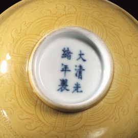 Ciotolina, Cina, sec. XIX, in porcellana gialla decorata con draghi, reca marchio sul fondo periodo Guangxu (1875-1908), diam. cm 11