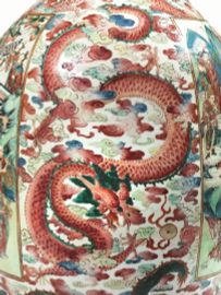 Coppia di vasi, Cina della Dinastia Qing sec. XIX, in porcellana policroma della famiglia rosa, decorati entro le riserve sagomate con scene di vita di corte, mentre il corpo dei vasi decorati con grandi draghi tra nuvole stilizzate, alt. cm 85, restauri e mancanti delle prese laterali (2)