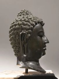 Scultura, Tailandia, sec. XVI-XVII, in bronzo, raffigurante testa di Budda, alt. cm 38 ,su base in marmo alt cm 6