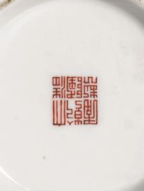 Vaso, Cina, sec XIX, in porcellana dalla forma bombata, decorato con volatili su un albero e motivi floreali, sulle anse applicazioni a rilevo modellate a testa di cane di Pho con in bocca un anello, reca marchio periodo Qianlong (1736-1795), alt. cm 20