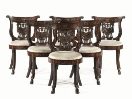 Finimento da salotto composto da un divano e sei sedie, Italia meridionale, prima metà sec. XIX , in noce ebanizzato e intarsiato in acero, pirografato con ricchi motivi floreali e mascheroni, spalliera a lira stilizzata, cartella intagliata ad aquile contrapposte sostenenti un festone, sedile circolare, gambe a sciabola su piedi a zoccolo equino, divano lungh. cm131, piccoli danni e mancanze (7)