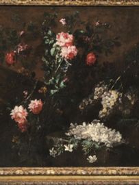 Citato nel 1983 da Ferdinando Bologna, e pubblicato per la prima volta da Ulisse e Gianluca Bocchi, il dipinto qui offerto è da considerarsi pendant di una composizione firmata per esteso “FRANCESCA VICENZINA FECIT” (Bocchi, 1998, fig. 103): insieme a quella costituisce dunque uno dei rari punti di partenza per la ricostruzione del catalogo dell’artista milanese. La sua appartenenza alla famiglia del francese italianizzato Vincenzo Volò, detto Vincenzino dei Fiori, padre di Margherita Caffi e del più giovane e noto Giuseppe Vicenzino oltre che della stessa Francesca, aveva reso difficile fino a quel momento identificare il suo contributo alla produzione di quella fiorente bottega. Come Margherita, infatti, Francesca dispone all’aperto e con grande libertà compositiva fiori recisi o disposti in vaso i cui colori scintillanti (prediletti il rosa, il bianco e il giallo) emergono dal fondo scuro. Rispetto a quelli della Caffi, i fiori di Francesca Vincenzina, talvolta accompagnati da verdure, risaltano per la loro precisa definizione, come poi quelli del più famoso Giuseppe, e sono appunto questi i dati che emergono dall’esame dello splendido dipinto qui proposto, importante anche per dimensioni.
