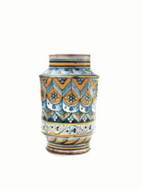 in maiolica decorata in policromia, corpo cilindrico appena rastremato al centro, spalla pronunciata dal profilo fortemente inclinato. L’imboccatura, dall’orlo dritto, si apre su un collo cilindrico piuttosto alto; il piede, basso, è a base piana. Il corpo ceramico color beige chiaro è coperto e smaltato anche all’interno del vaso. La decorazione mostra al centro del vaso un amorino che danza suonando il liuto su un prato, compreso in una riserva che ne segue il profilo. Intorno corre per tutto il resto del corpo un tessuto decorativo a losanghe arancio e blu dall’andamento simmetrico. Un motivo a baccellature interessa la spalla, mentre sul piede corre una corona di foglie lanceolate coerente. Nel cartiglio farmaceutico delineato in blu si legge DIACINAMOMO, un preparato a base di cannella: antiossidante, antipiretico. Per forma e caratteristiche decorative, si ritiene che l’opera si possa inserire nella produzione di manifatture pesaresi dei primi decenni del secolo XVI, alt. cm 25, diam. bocca cm 11,2, diam. base 12.