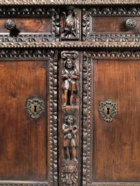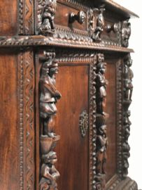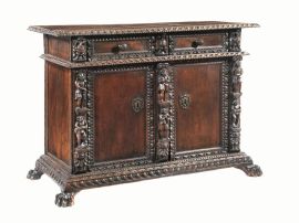 in noce a patina scura intagliato e scolpito; piano rettangolare con bordo baccellato, due cassetti appaiati nella fascia e due sportelli sottostanti con cornici riccamente scolpite a foglie stilizzate; lesene e fascia centrale scolpiti con figure in alto rilievo, base baccellata su piedi a zampa ferina, cm 104x137x53