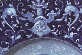 in maiolica integralmente ricoperto da smalto “berettino”, profondo cavetto e larga tesa appena obliqua. Al centro della composizione spicca una figura femminile stante rivolta verso sinistra con un arco nella mano sinistra e una freccia nella destra, mentre una chiesa con campanile turrito è nella parte destra del paesaggio montuoso. Il cavetto è incorniciato da una sottile fascia decorata in bianco su fondo azzurrato. Sulla tesa si estende una decorazione “a grottesche monocrome” in una variante che prevede una disposizione simmetrica centrata, nei punti cardinali, da cariatidi alternate a mascheroni circondati da nastri sinuosi e delfini. Sul verso, all’interno del piede, si registra la presenza di un simbolo con tre cerchi concentrici; tutt’intorno, fino all’orlo, è presente un motivo “alla porcellana” disposto simmetricamente, con fioretti a corolla continua e serpentine realizzati tutti in blu cobalto in una grafia rigida e con una disposizione simmetrica. Il piatto, proveniente dalla collezione Adda (B. Rackham, Islamic Pottery and Italian Maiolica. Illustrated Catalogue of a Private Collection, Londra 1959, p. 84 n. 310, tavv. 123a e 123b), fu poi venduto a Londra nel 1970 da Cyril Humphris; alt. cm 4,4, diam cm 29, diam. piede cm 9,3