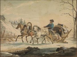 Due tempere su carta raffiguranti slitte tirate da cavalli attraverso la campagna russa.