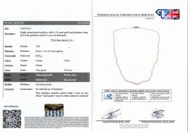 realizzata ad un filo di perle naturali con fermatura traforata centrata da uno zaffiro sintetico ovale e rose di diamante, corredata di certificato GCS n. 5775-1974 datato 19/05/2015