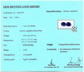 ciascuno a corolla stilizzata in diamanti rotondi e baguette, al centro uno zaffiro ovale rispettivamente di 2.80 ct e 2.39 ct, corredati di certificati GRS n. 2014-113355 datato 19/12/2014 e Stalwart n. 12623199 datato 07/11/2014 che indicano origine birmana e nessun trattamento termico