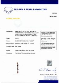 realizzato da brillanti rotondi e foglie analogamente decorate, finale una perla naturale rosa, corredato di certificato The Gem & Pearl Laboratory n. 10194, datato 18/05/2014