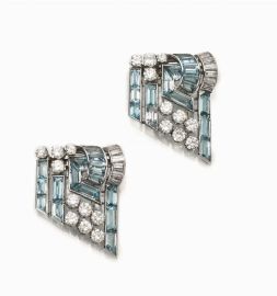 modellata come due clip a motivi geometrici stilizzati decorate in acquemarine baguette e trapezoidali e brillanti rotondi e baguette, punzoni oro 750 e plat 950, 26 g